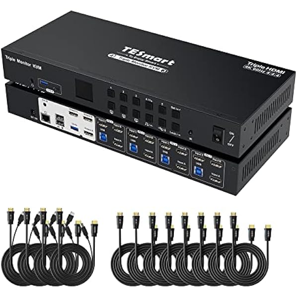 works great after you set it up properly. there are a couple of items that are not explained or fully disclosed as to what you will need to connect to your pc/laptops. for each laptop or pc you will need an hdmi/usb cable which is provided in the kit to run from your pc/laptop taking up one hdmi and one usb port on your pc/laptop to the usb and hdmi -monitor port on the kvm switch (either a/b/c depending on which monitor you want which pc/laptop to display on). this only allows you to display up to three pcs or laptops on one of the three monitors (one pc/laptop of the four pc/laptops possible to be connected to the kvm switch to display on one of the three monitors). if you want to display each of the pc/laptops across all three monitors at once - you will need to two additional hdmi-hdmi cables per pc/laptop and two additional hdmi ports on each pc/laptop. here are the problems: one this is not made clear in the product descriptions to know this before purchase, two: there are not enough hdmi-hdmi cables provided to connect all possible four pc/laptops. there are enough for connection of three pc/laptops with one extra hdmi-hdmi cable, to hook-up four pc/laptops you will need to purchase at least one additional hdmi-hdmi cable, and three: you need to look at your pc/laptops carefully. most will not have three hdmi ports and a usb port. the normal standard for laptops is two usb, one hdmi, and one usb-c. to make this work you will therefore need a usb or usb-c docking station for each pc/laptop that does not have enough hdmi ports. in my configuration of three laptops connected to three monitors in which i wanted to display each of the laptops across all of the three monitors one laptop at a time - i needed to purchase three usb-c hubs with each usb-c hub having at least two hdmi ports. i connected each usb-c hub to each of the individual laptops via a usb-c port and then connected the two additional hdmi-hdmi cables into the usb-c hdmi ports and then to the kvm switch input ports for each pc/laptop connections for the two monitors not connected by the previous hdmi-usb cable. this was an expense that was not clearly identified in the purchase advertisement literature or even explained well in the product user-manual. i had to go out to the web and find third party videos and articles on the set-up before this became clear.